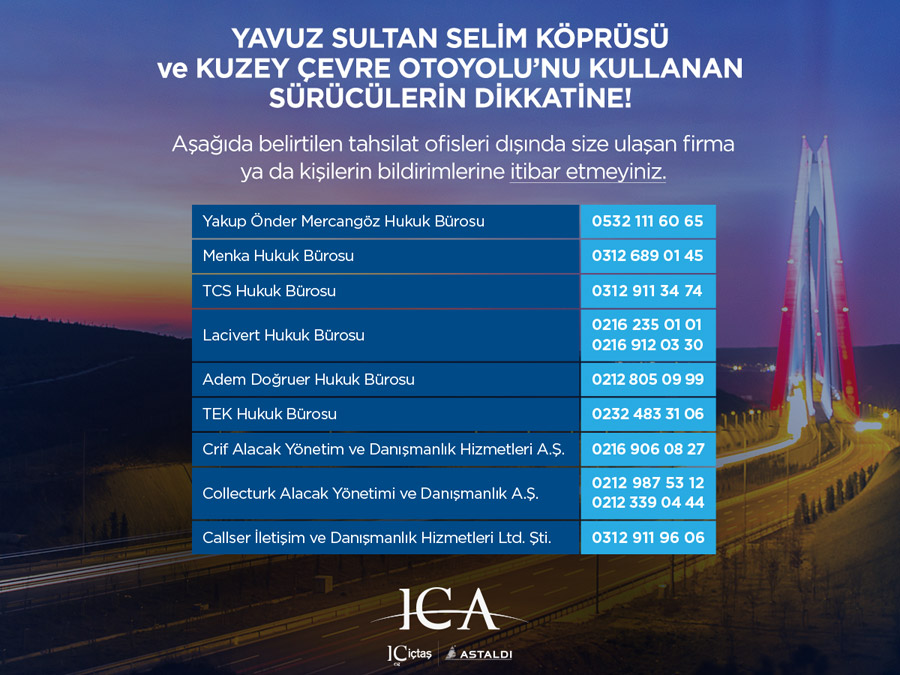 Yavuz Sultan Selim Köprüsü ve Kuzey Çevre Otoyolu’nda gerçekleşen ihlalli geçişlere ilişkin hukuki süreçlerin takibi amacıyla yetkilendirilmiş tahsilat ofisleri dışında size ulaşan firma ya da kişilerin bildirimlerine itibar etmeyiniz. Yavuz Sultan Selim Köprüsü ve Kuzey Çevre Otoyolu’nda ihlalli geçişlerden kaynaklı borçlarınızı www.ysskoprusuveotoyolu.com.tr, YSS Kopru mobil uygulaması, Ziraat Bankası ve Halkbank aracılığı ile ödeyebilirsiniz. Bunlar dışında bir ödeme kanalına yönlendirilmeniz durumunda, konuyu yasal mercilere ve 0850 502 71 00 numaralı çağrı merkezimize aktarmanızı önemle rica ederiz.